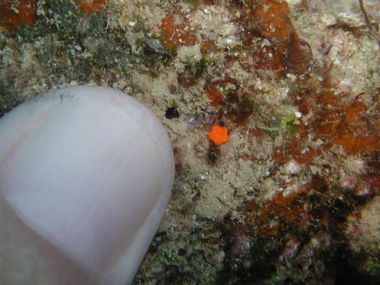 かわいいオレンジ赤色のヒトデ。私はずっとこいつがカワテブクロの子供かと思っていたのですが、この写真からだけでは詳しいことはわからないのだそうです。